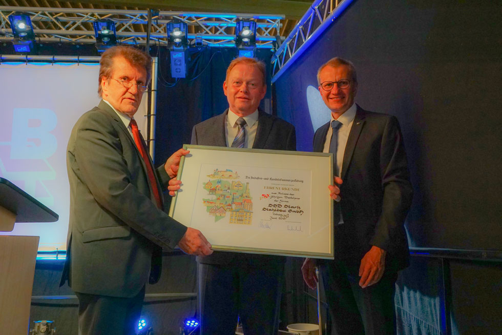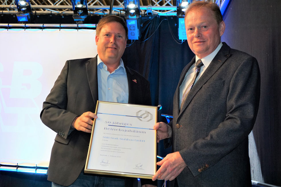 Vom traditionellen Handwerksunternehmen zum innovativen mittelständischen Stahlbauunternehmen mit zwei Werken in Franken und Südthrüingen: Mit einem bunten Rahmenprogramm feierte die SSB Stark Stahlbau GmbH 50-jähriges Bestehen im Beisein von zahlreichen Gästen aus Wirtschaft und Politik. lHK-Präsident Friedrich Herdan überreichte Geschäftsführer Thomas Stark eine Ehrenurkunde zum 50-jährigen Bestehen. Damit würdigte er die Leistungen des Unternehmens, das als Innovationsmotor der Region gilt. Eine weitere Ehrenurkunde zum 50-jährigen Betriebsjubiläum überreichte der Kreishandwerksmeister Jens Beland von der Handwerkskammer für Oberfranken.