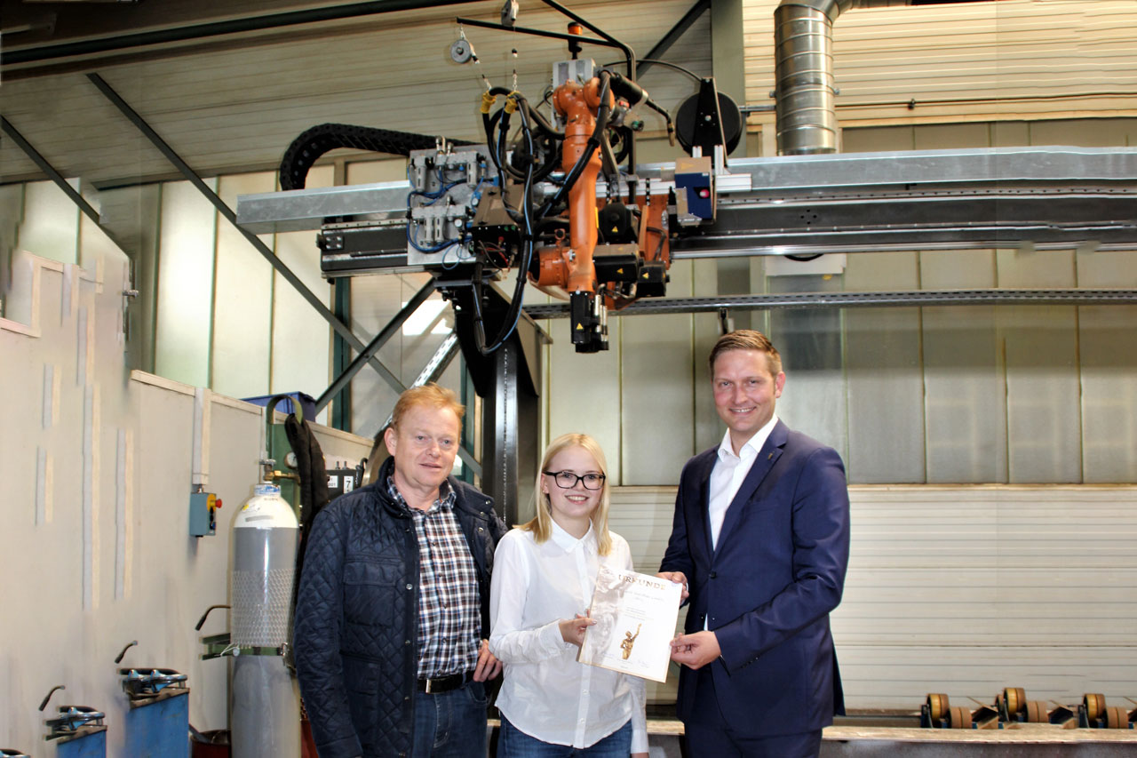 Eine dieser Investitionen konnte sich der Kuratoriumsvorsitzende der Oskar-Patzelt-Stiftung, Christian Wewezow, live vor Ort ansehen: Den schutzzaunlosen Schweißroboter Kuka Jet, der seit 2017 „vielseitige und einfache Routine-Schweißaufgaben genauso übernimmt wie hochkomplexe“. Für die einfachen Routine-Schweißaufgaben sei es sehr schwer geworden, genügend Personal zu finden. „Für solche einfachen Aufgaben will ich meine hochspezialisierten Mitarbeiter auch gar nicht heranziehen“, sagte Thomas Stark.